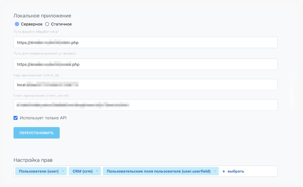 Для подключения к REST API, было создано локальное приложение, которое хранится у нас на сервере.