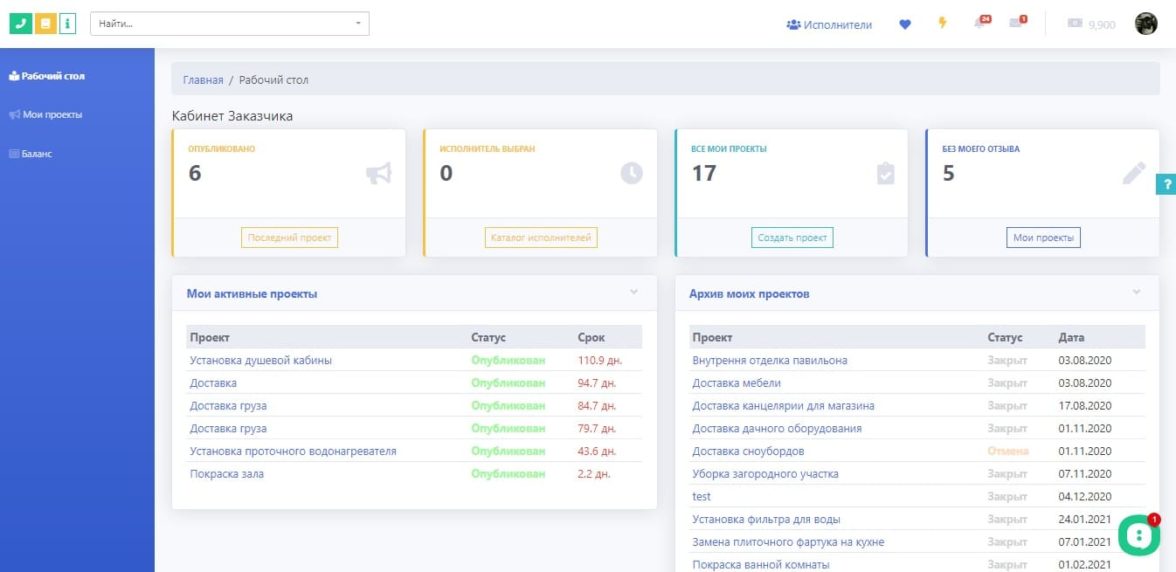 Рабочее место заказчика, где он может управлять своими проектами/заказами, редактировать профиль, работать с уведомлениями и метриками.