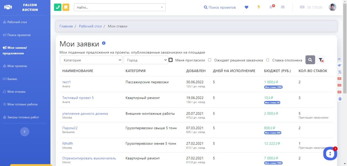 Просмотр моих ставок. Исполнитель может просмотреть те проекты, на которые он уже сделал ставки, изменить или отменить эти ставки.