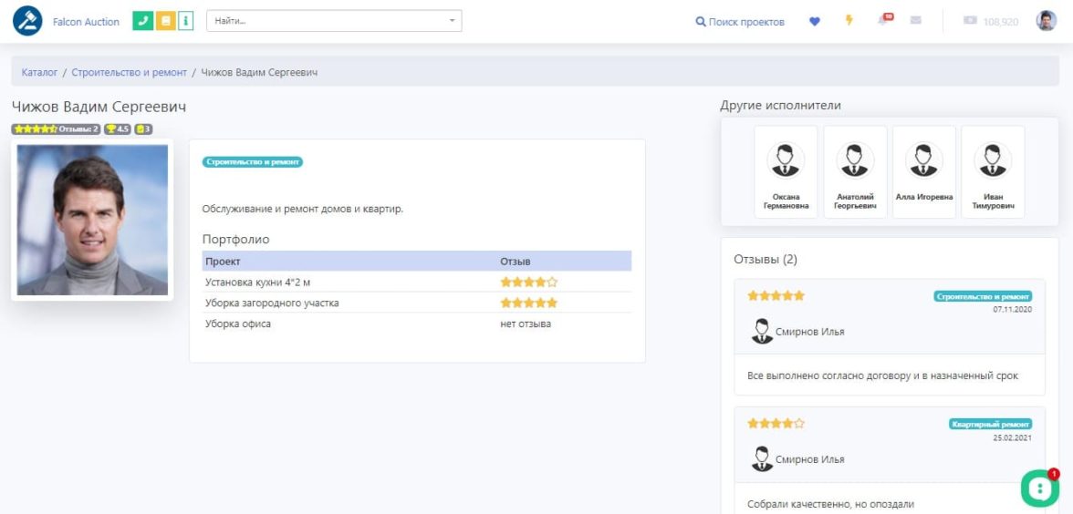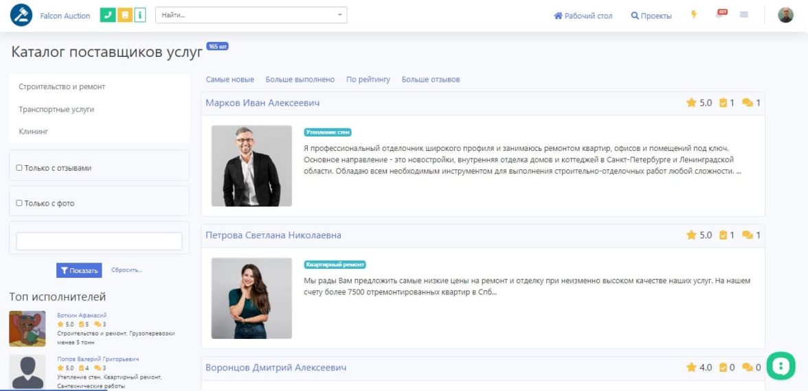 Возможность найти подходящего подрядчика по всевозможным фильтрам и связаться с ними. Предложить ему проект напрямую. Либо заказать его услуги из магазина готовых работ.