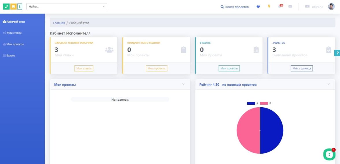 При входе исполнитель видит свой дашборд и основные данные по своей деятельности на площадке. Состав данных и формат отображения можно менять под свои нужды. Добавлять новые отчеты, показывать другие числа и т.д.