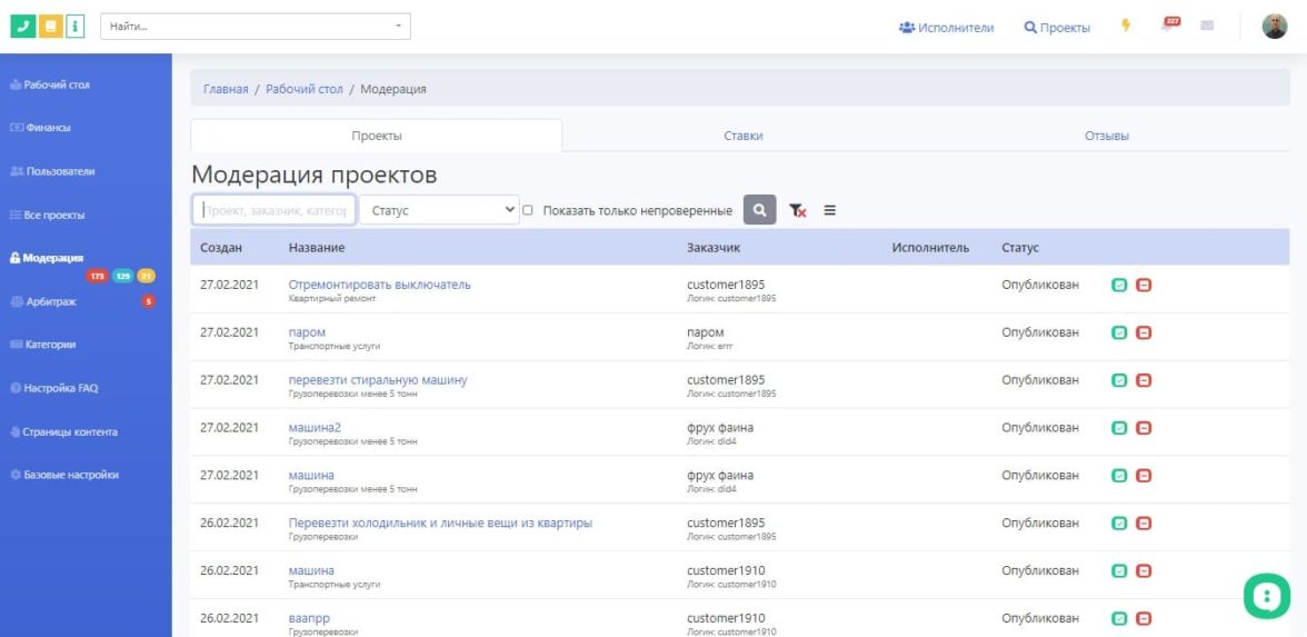 Аналогичная история будет и у клиента — он может менять свой профиль, просматривать проекты, создавать новый проект, вести переписку с исполнителями. Приводить скрины кабинета заказчика здесь не буду, вы можете посмотреть страницы на живом демо. Для этого нужно выйти из учетной записи «Исполнитель»и на главной странице в Демо создать своего пользователя-Заказчика: «Площадка услуг — Заказчик».