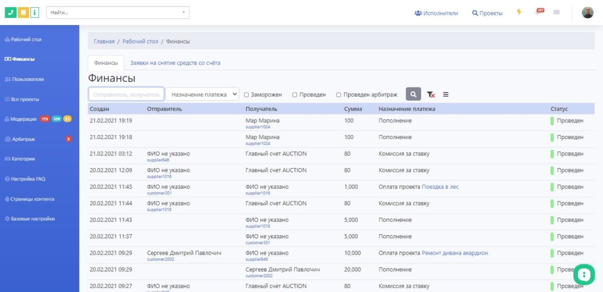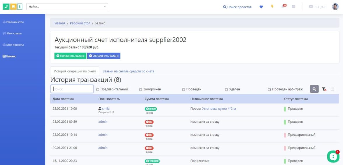 Баланс. У исполнителя должна быть возможность просмотреть историю транзакций и текущий свой баланс, а также подать заявку на вывод денег из системы, которую обработает администрация.