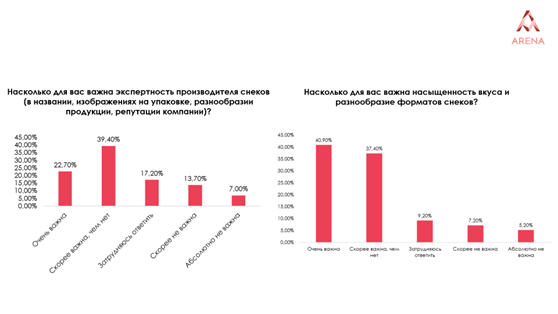 2. 62% респондентов считают экспертность производителя главным атрибутом снеков. Для чуть большей части опрошенных (78%) основным критерием выбора являются насыщенность вкусов и разнообразие форматов.