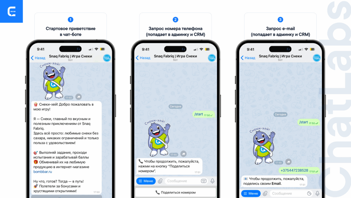 Бренд, запустивший спецпроект в мессенджере, получает контакты активной «живой» аудитории. Например, на старте Телеграм-бот запрашивает номер телефона и email, а также проверяет подписку на Telegram-канал. В системе учета сохраняются данные: Telegram ID, nickname, телефон и адрес почты.