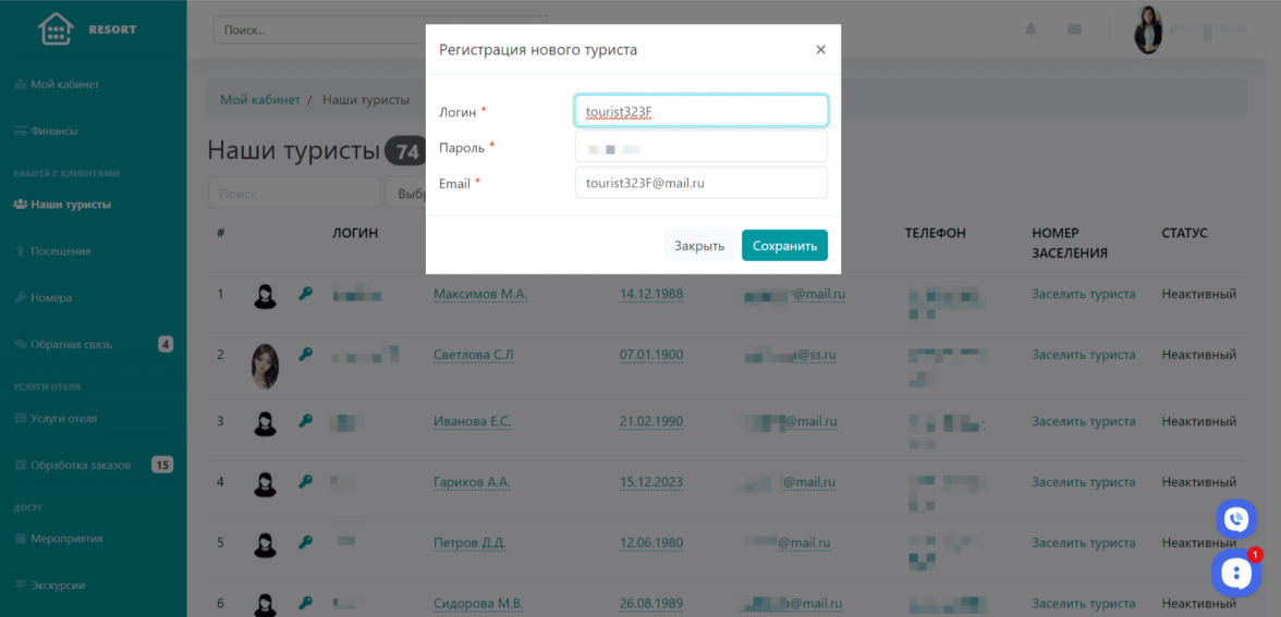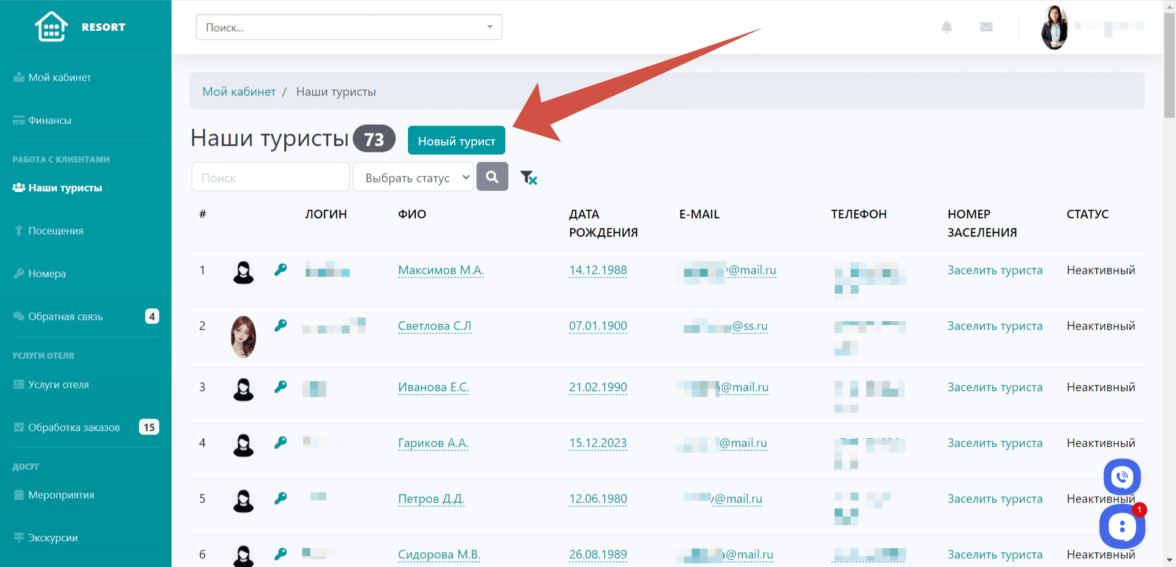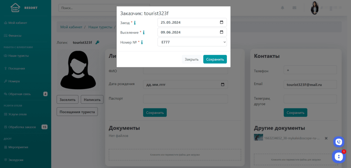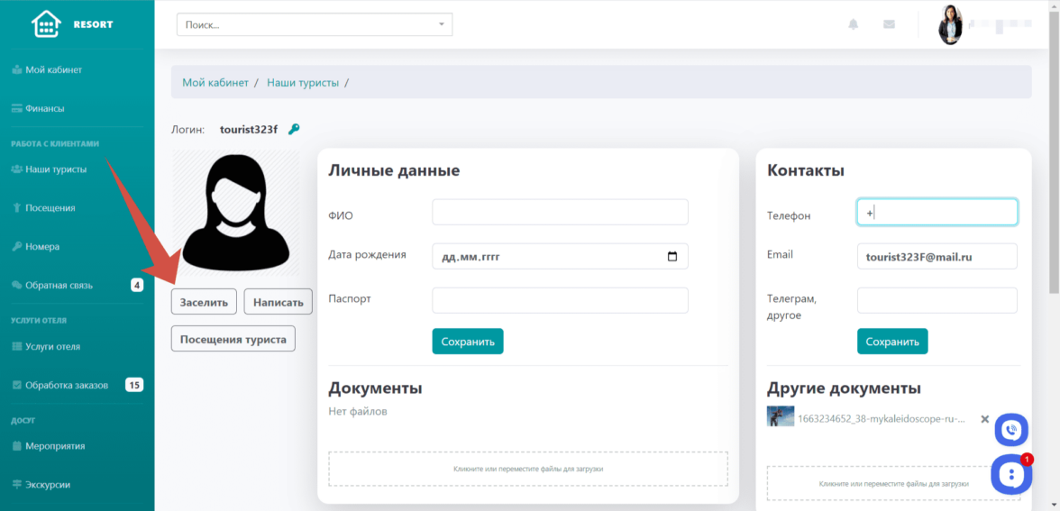 Заселение нового туриста в отель