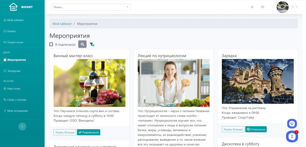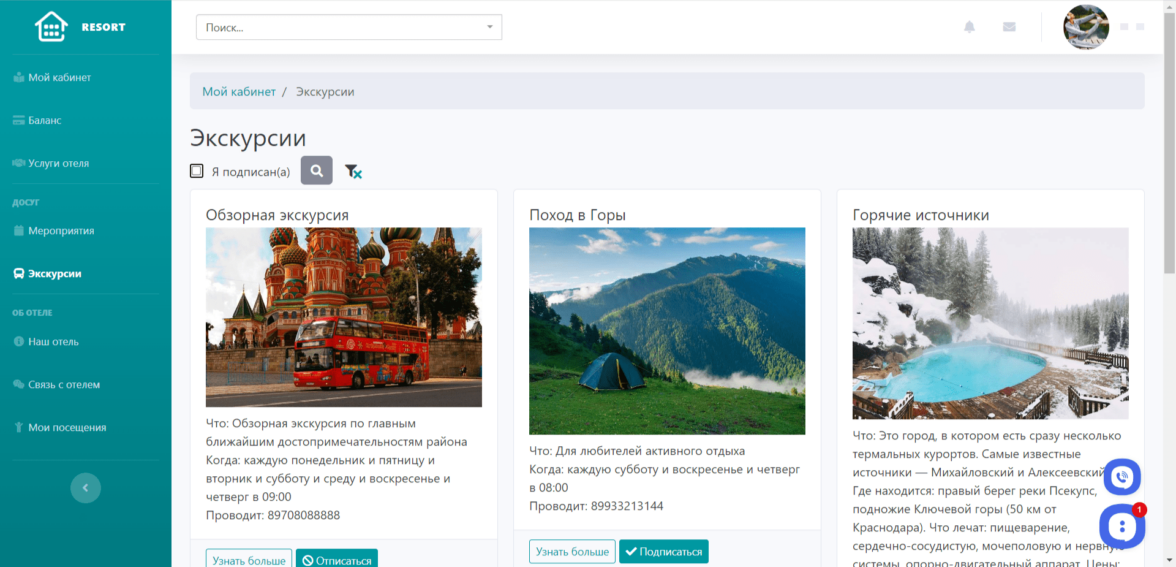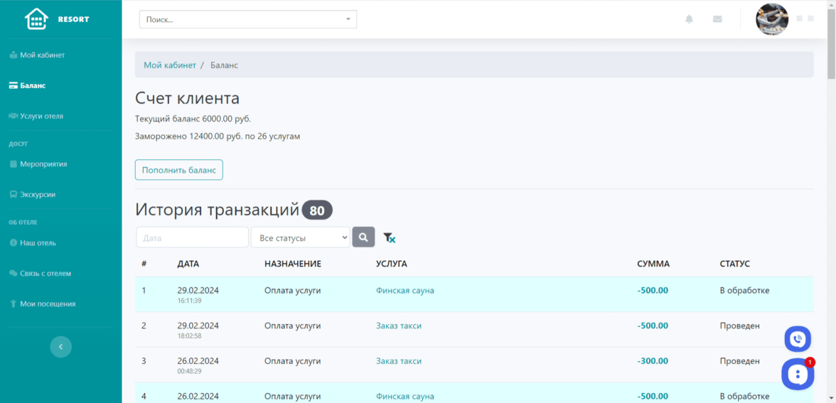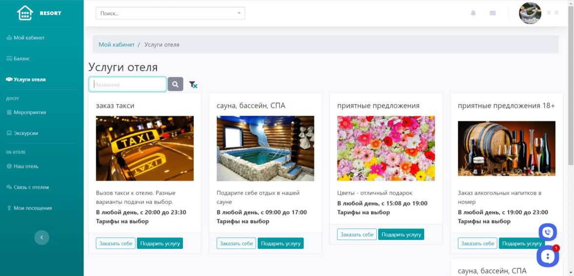 Личное пространство для клиентов отеля или гостиницы, в котором они могут заказывать услуги отеля, писать обращения, записываться на мероприятия и экскурсии. А также управлять заказами, обращениями и записями с помощью дашбордов.