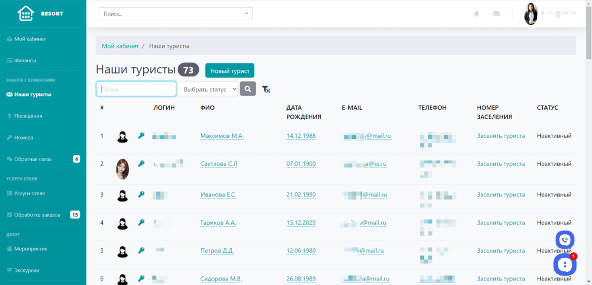 Здесь хранится вся информация о посетителях отеля, прошлых и будущих. Менеджер может добавлять туристов, редактировать информацию о них, заселять их в номера.
