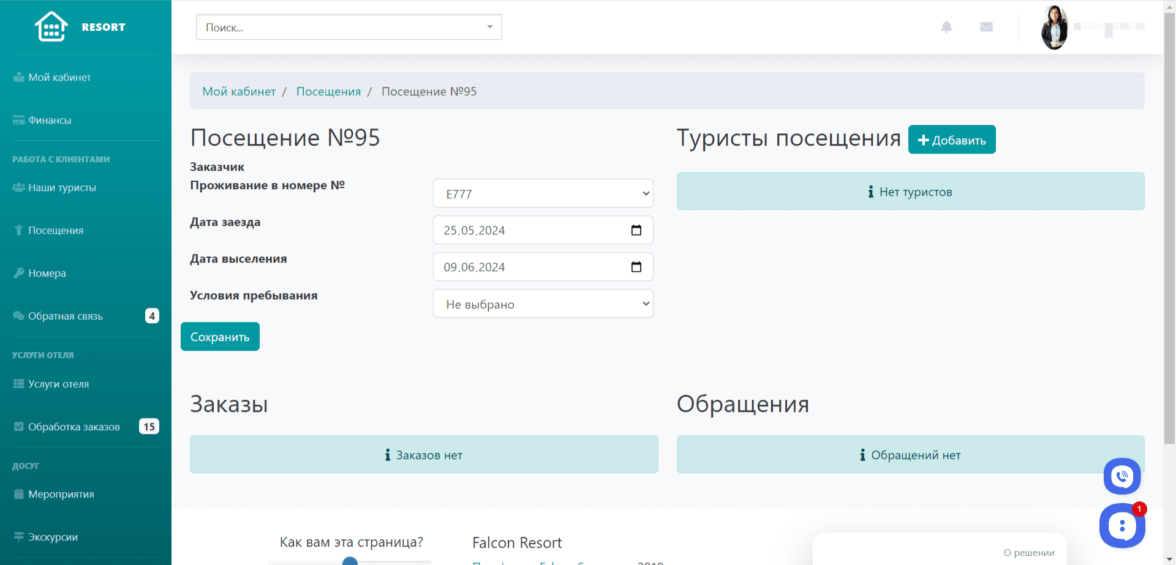 В посещение можно добавить туристов и указать условия пребывания (например «Всё включено»). Заказы туристов во время посещения указаны в специальном блоке.