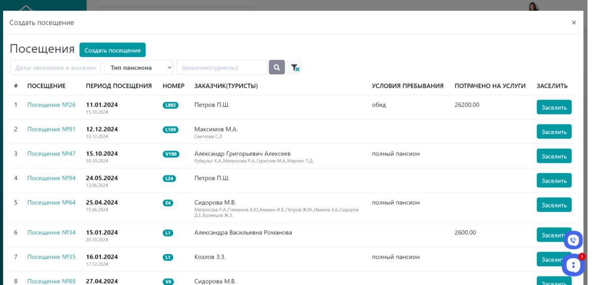 Менеджер видит все посещения, а также может создать новое посещение для номера на определенную дату и заселить в него туристов.