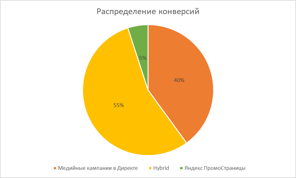 Hybrid обеспечил наибольшее количество конверсий благодаря эффективному таргетингу и разнообразию форматов.