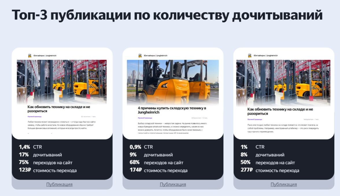 Самой эффективной стала статья «Как обновить технику на складе и не разориться» — 17% дочитываний и 75% переходов на рекламируемый сайт.