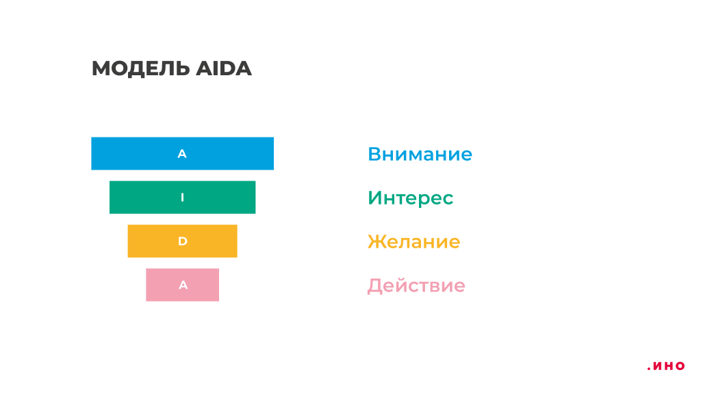 Существует модель AIDA, которая давно используется в рекламных материалах. Её цель — подвести человека к действию. В случае карьерных сайтов это те действия, о которых мы говорили в пункте «Определить метрики и целевые действия».