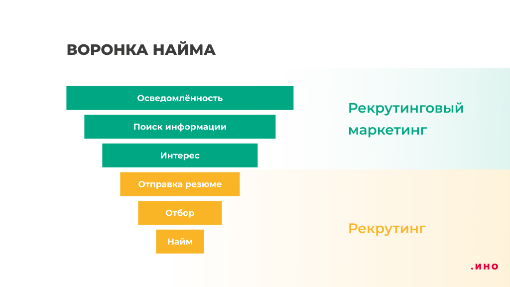 Перед тем как устроиться в компанию, кандидат проходит определённые этапы — осведомлённость, поиск информации, интерес, отправка резюме, отбор и найм. Эту воронку делят на два глобальных процесса в HR — рекрутинговый маркетинг и рекрутинг.
