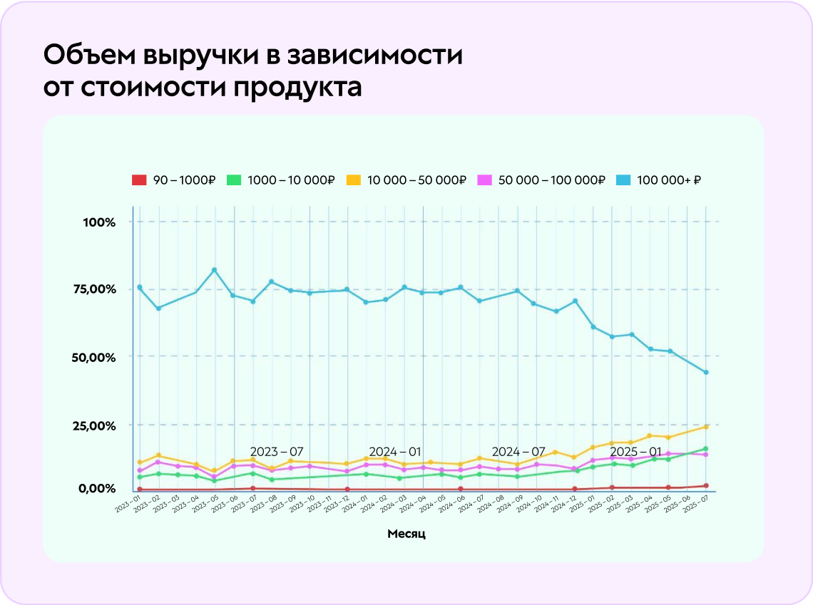 Учитывая тренд на рост популярности чеков от 1 до 50 тысяч рублей, я рекомендую активно использовать для таких продуктов оплату по частям. У этого подхода несколько ключевых преимуществ: