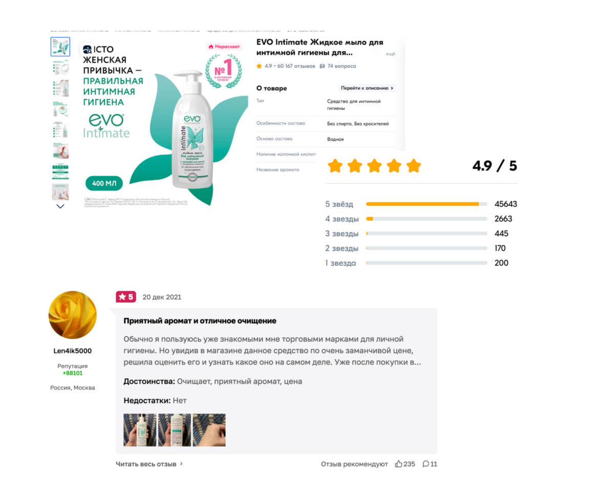 По результатам опросов Анкетолог, 53% целевой аудитории приобретают средства интимной гигиены на маркетплейсах. Поэтому работа с информацией и отзывами — важный блок нашей работы с клиентом.