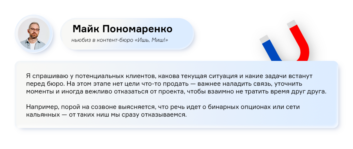 Как уже сказали выше, у нас нет должности продажника. Всю работу на этапе продаж ведет ньюбиз Майк Пономаренко — сооснователь бюро и один из двух главных Миш. Он знает все о наших ценностях и принципах работы, потому что сам их создавал.