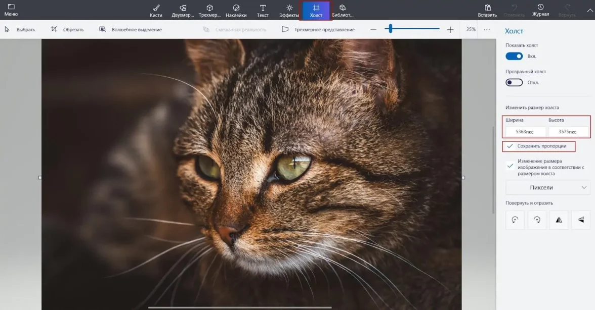 Уменьшить картинку в Paint можно через вкладку «Холст». Для этого нужно указать желаемый размер в пикселях или в процентах от исходного. При нажатии соответствующей галочки сохранятся пропорции изображения.