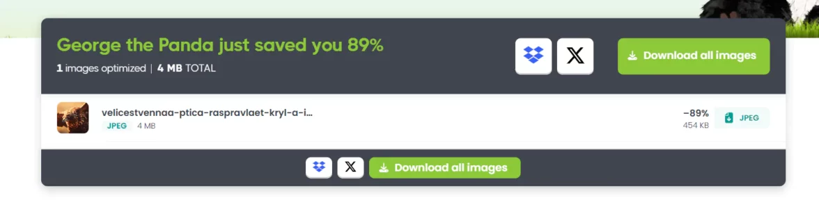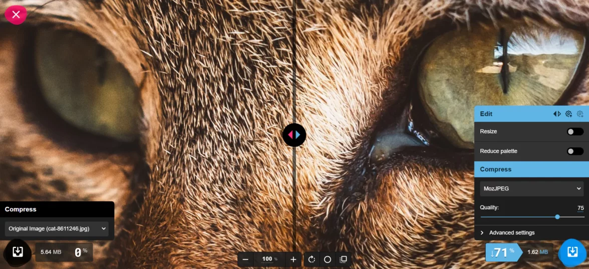 Optimizilla подходит для быстрого и простого сжатия небольшой партии JPEG и PNG-файлов, когда нужен контроль над степенью сжатия. Более применим для личных повседневных нужд, например, подготовки архива фотографий.