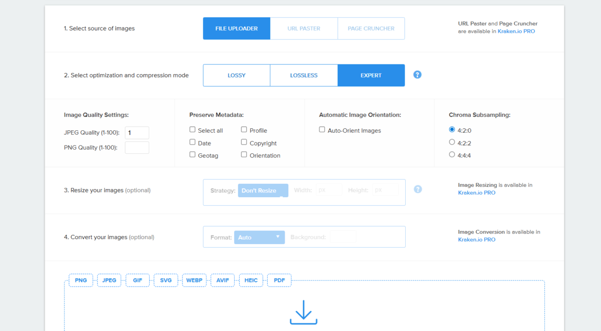 • Доступны все веб-форматы изображений, в том числе редкие, например, OxiPNG или AVIF.