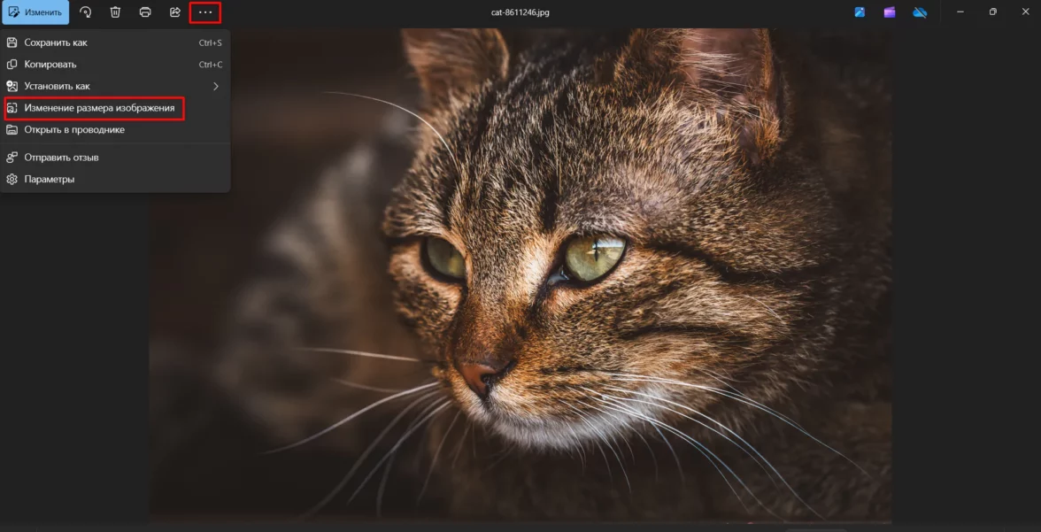 Еще один способ, как уменьшить изображение — через стандартную программу «Фотографии» в Windows 10 и Windows 11. Для этого нужно выбрать соответствующую опцию в раскрывающимся меню. Далее нужно указать желаемые параметры в пикселях или процентах, а также выбрать формат файла и уровень сжатия (для JPG изображений).