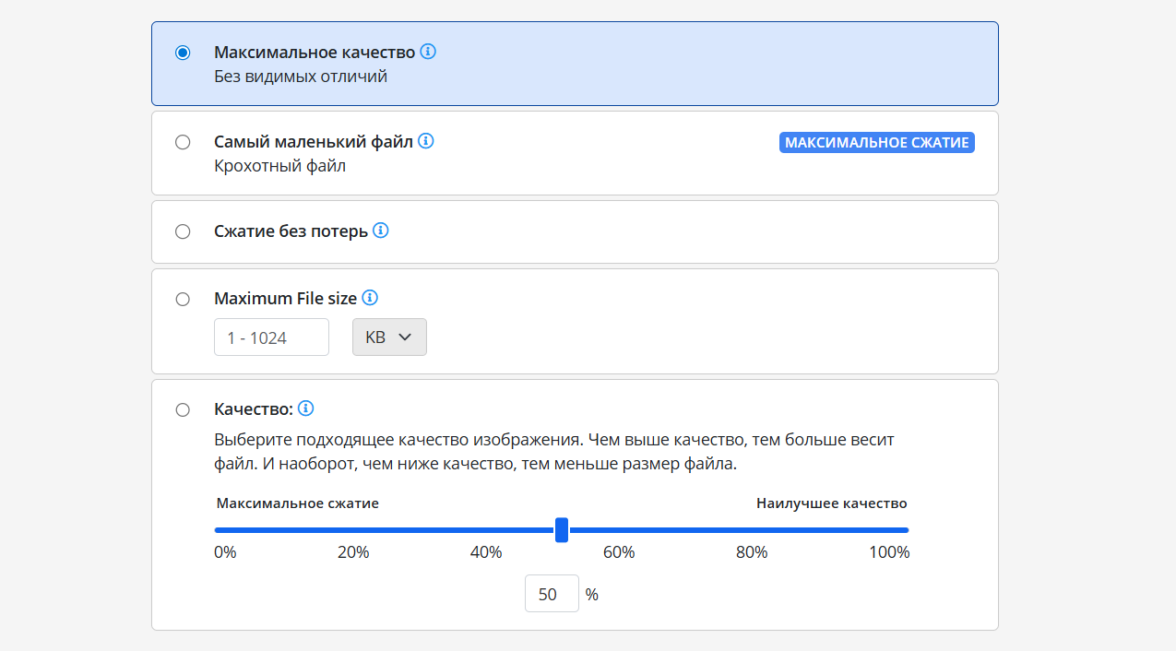 • максимально возможное сжатие размера без учета качества итогового изображения.