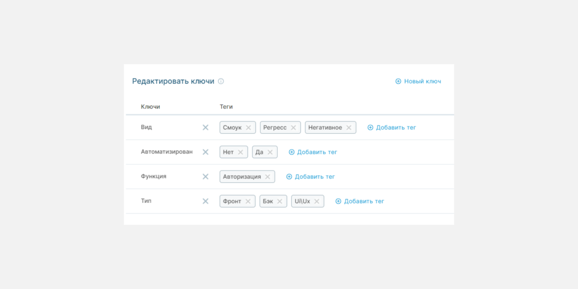 Ключи и теги помогают объединять тест-кейсы в группы по ключевым словам — создавать их можно по своему усмотрению и логике проекта.