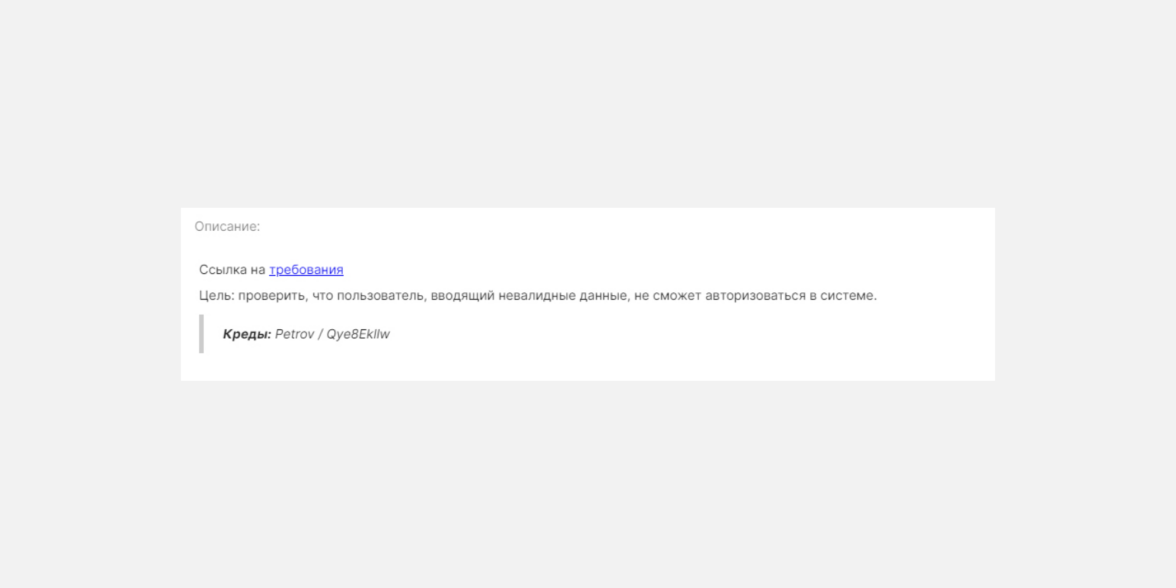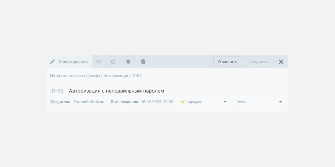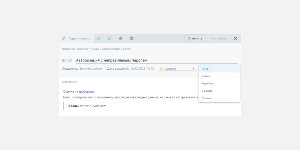 Здесь удобно указывать данные, которые понадобятся при работе с тест-кейсом: дату создания, автора, ссылки на стенд и требования, креды для авторизации и так далее.