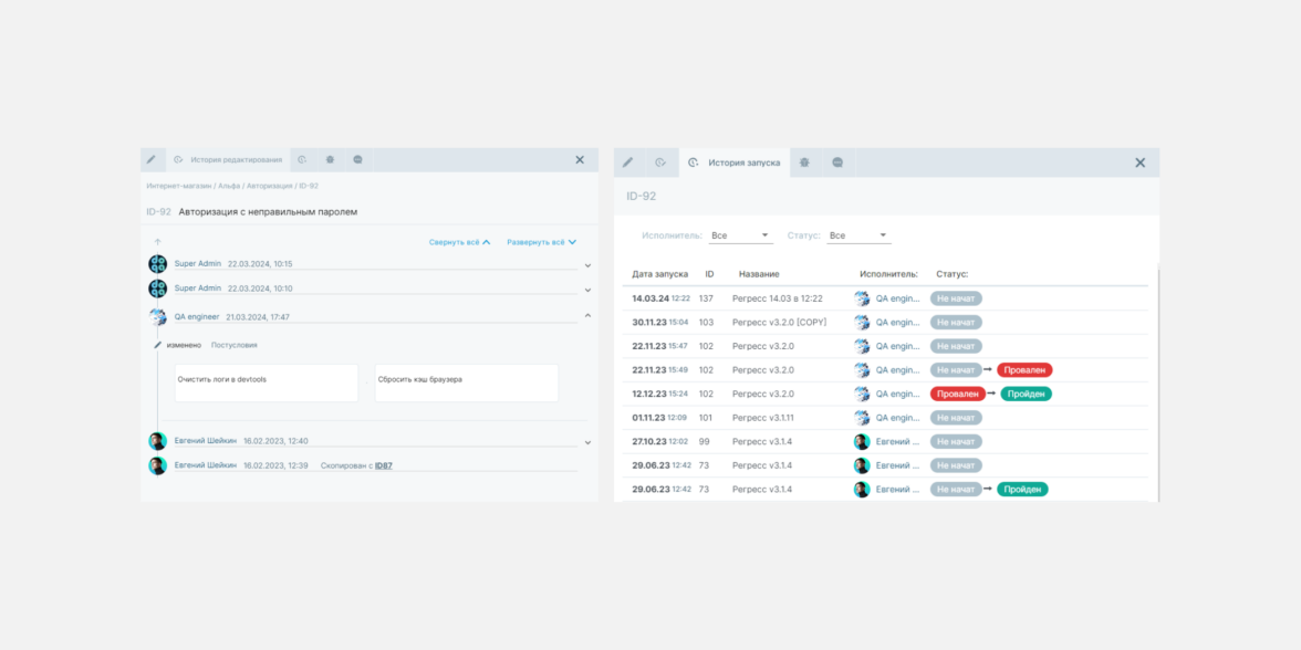 История позволяет просматривать, кто, когда и какие изменения внес в тест-кейс, в каких прогонах он участвовал, и какие были результаты. Этот функционал избавляет от хаоса в команде, помогает отслеживать актуальное состояние тест-кейса и без проблем передавать работу коллегам — они всегда будут знать, к кому обратиться с вопросами, потому что автор изменений указан прямо в системе.