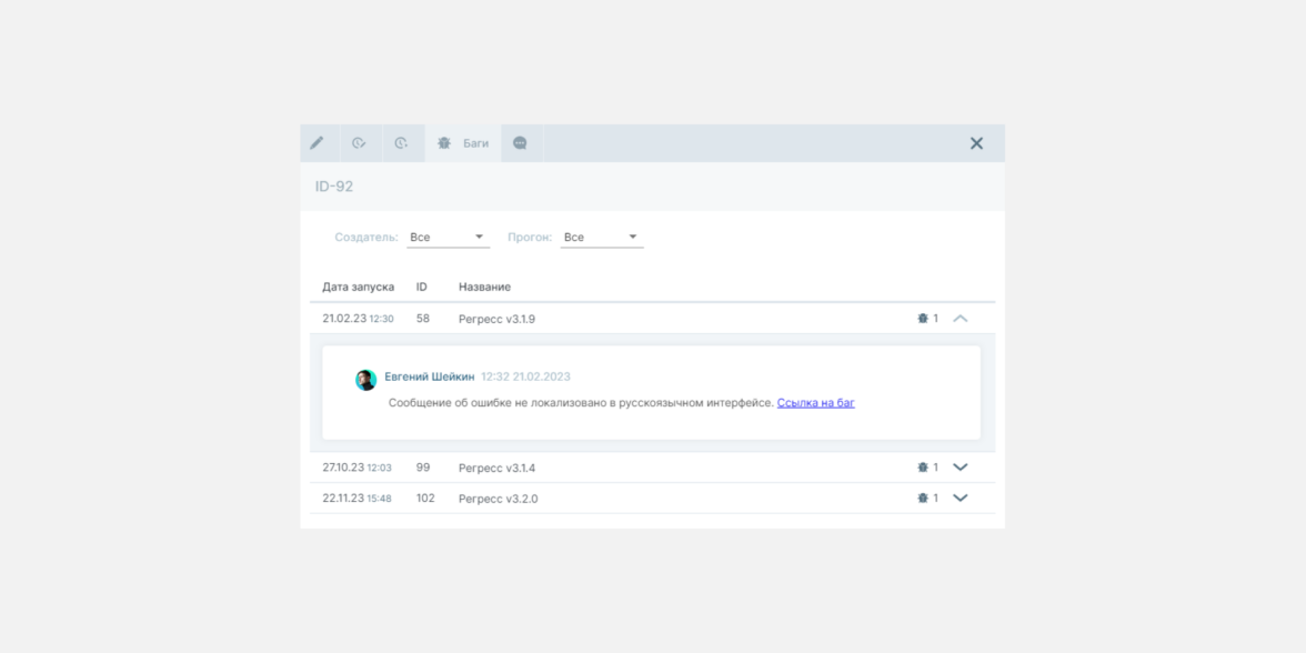 Если в результате прохождения кейса будут выявлены баги, то информация об этом появится в окне конкретного тест-кейса — ничего не потеряется.