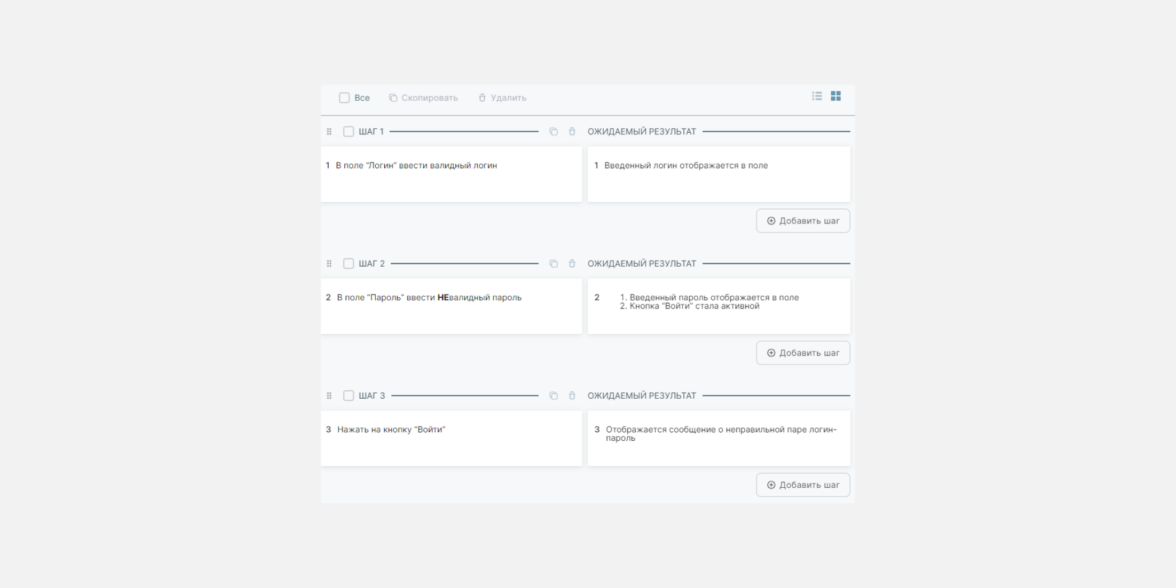 Чтобы этого избежать, необходимо дробить кейсы на минимально необходимое число шагов для выполнения одной проверки и недвусмысленно формулировать ожидаемые итоги действий в каждом.