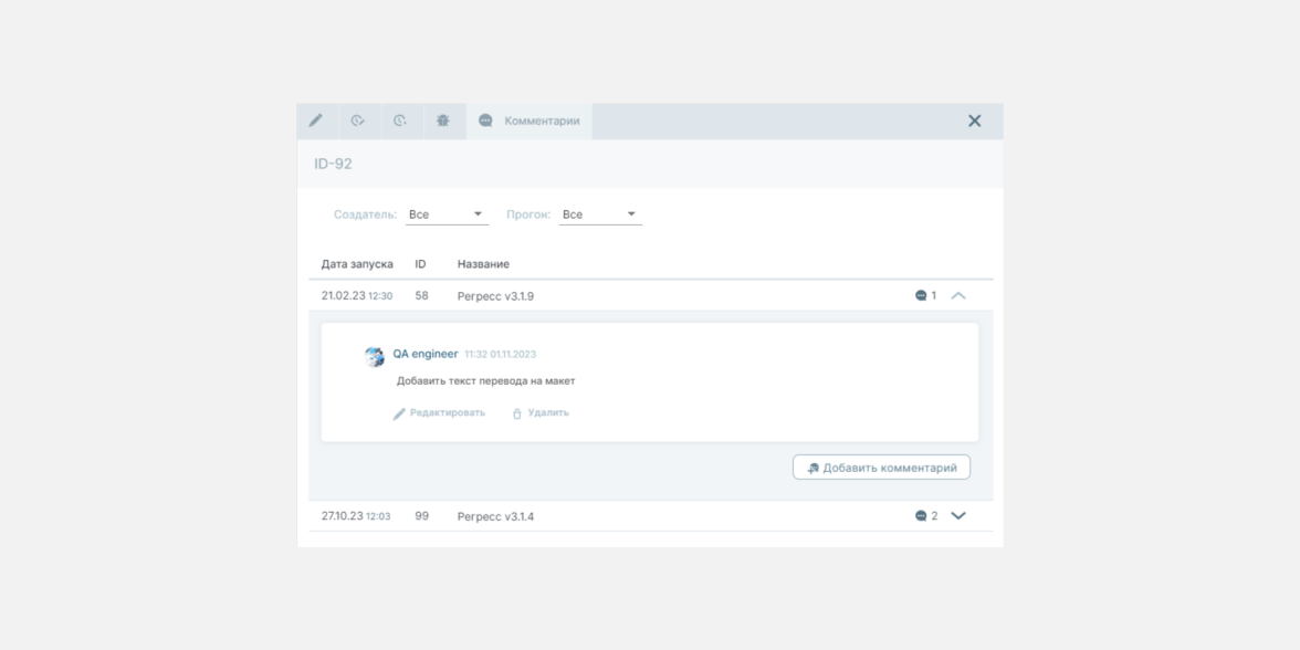 Удобная вкладка для информирования коллег об изменениях. Например, если тестировщик проходил тест-кейс, нашел в нем ошибку и исправил ее, то он может оставить комментарий для других о том, что в тест-кейсе изменилась определенная часть, и теперь все работает правильно.