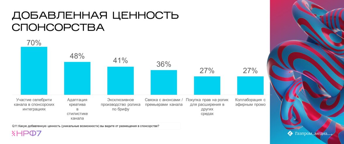 Участие селебрити, адаптация в стилистике канала, эксклюзивное производство ролика по брифу — основные факторы добавленной ценности в спонсорстве, — считают рекламодатели.