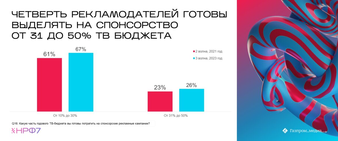 Позитивный опыт работы с инструментом отражается в том числе и на финансовом планировании. Количество игроков, готовых потратить на спонсорские кампании до 30% годового ТВ-бюджета, выросло по сравнению с 2021 годом на 6 п.п.