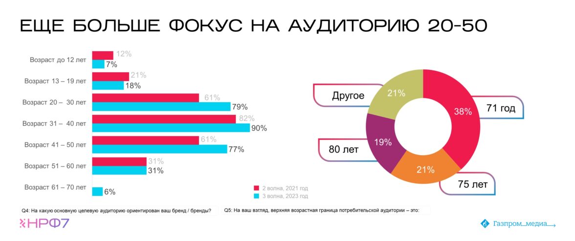 Если говорить о целевой аудитории, большинство брендов продолжают ориентироваться в своих рекламных кампаниях на сегмент в возрасте 20–50 лет. При этом верхняя возрастная граница потребительской аудитории расширилась до 71 года. Для сравнения, в 2021 году большинство респондентов отмечали границу в 65+ лет.