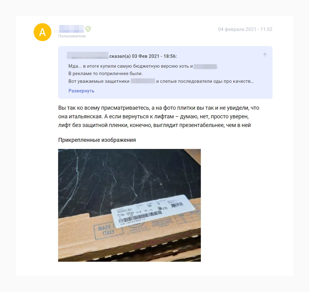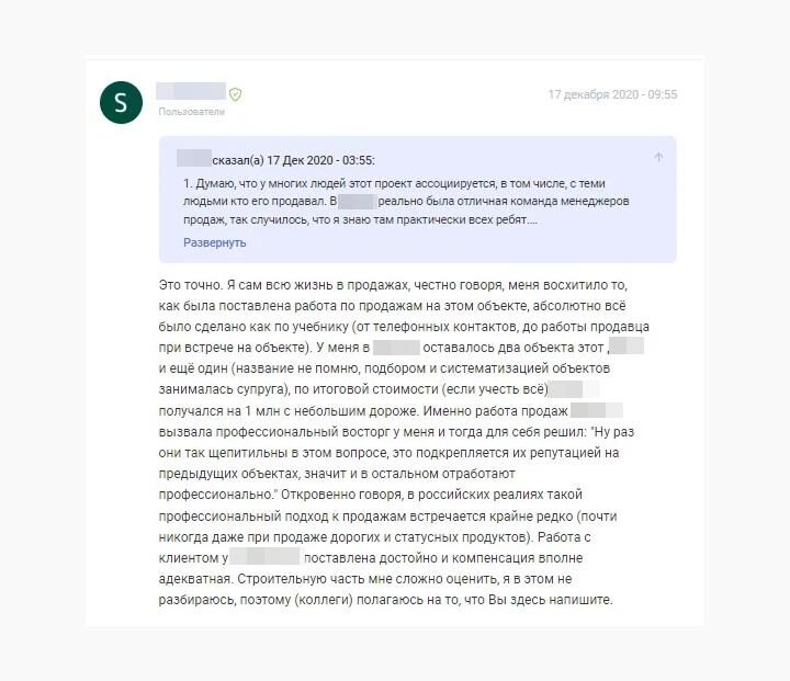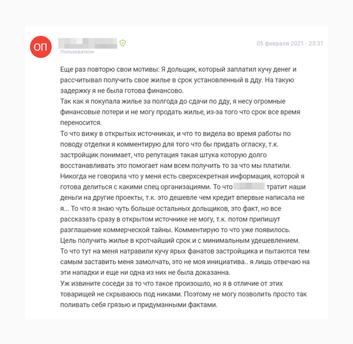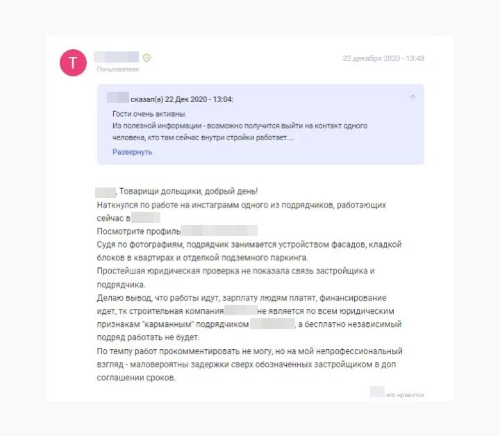 На первом этапе работ, мы делали упор на то, что необходимо подтвердить факт причастности пользователей форума к застройщику, аргументируя это тем, что многие участники обсуждения возможно и не являются клиентами заказчика. Наши активные действия привлекли внимание модератора форума. В результате была создана отдельная ветка для авторизованных пользователей, предоставивших сканы официальных документов, подтверждающих факт сотрудничества с компанией. Проверенные пользователи отмечались вот таким значком справа от имени.
