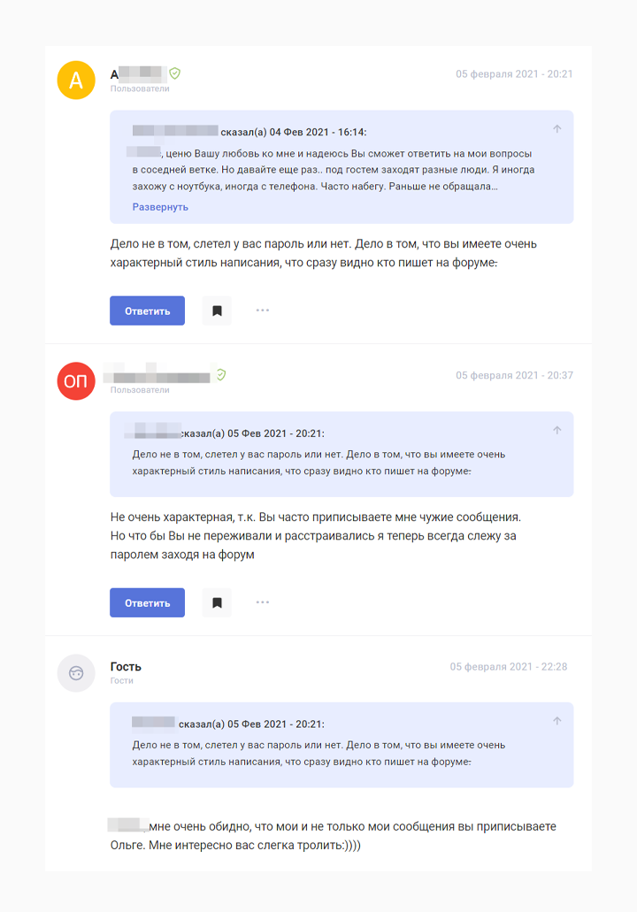Уровень доверия к информации, которая поступает из разных источников, всегда выше. Поэтому продолжили идти по пути массовости. Внедрили на форум несколько групп агентов влияния. При этом для каждого агента влияния был тщательно подобран портрет, биография, характер и стиль общения.
