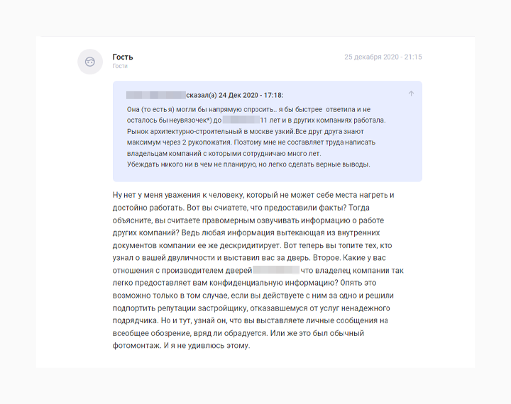 Ситуация накалялась. Мистер N начал допускать ошибки. В стремлении доказать свою правоту негативщик предоставил скрины личной переписки с партнером, в которой «за глаза» обсуждалось сотрудничество с компанией.