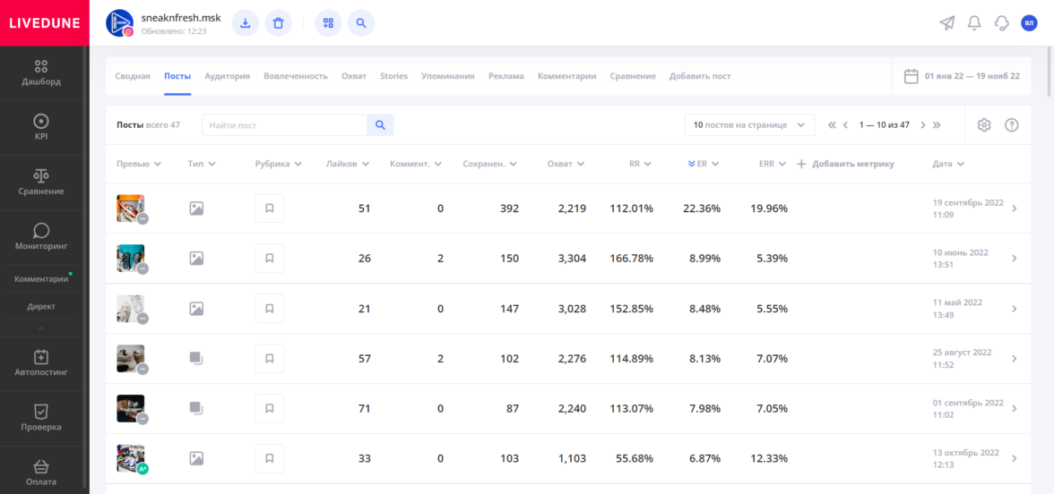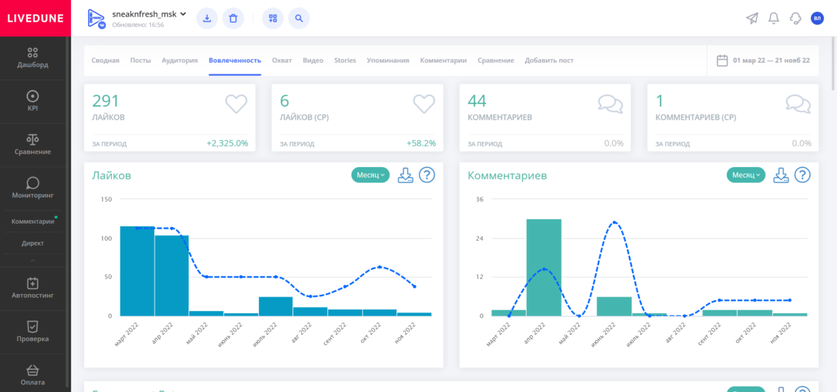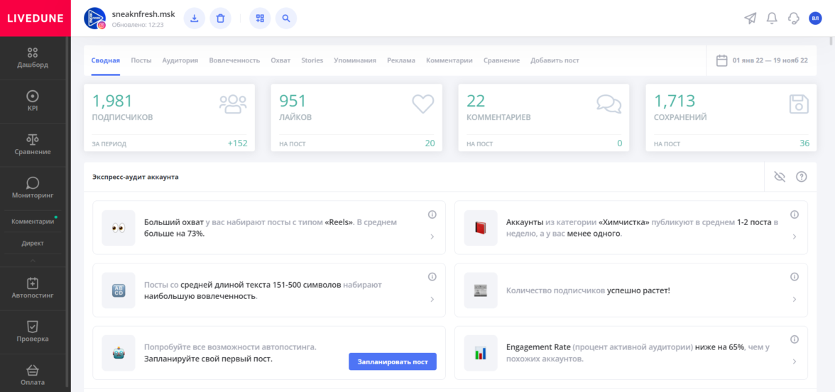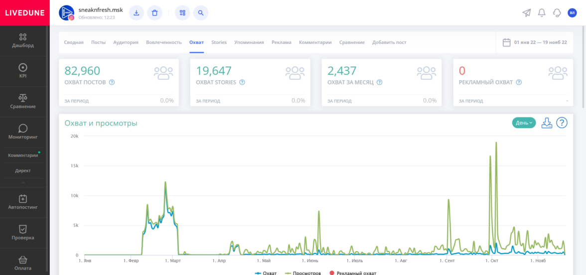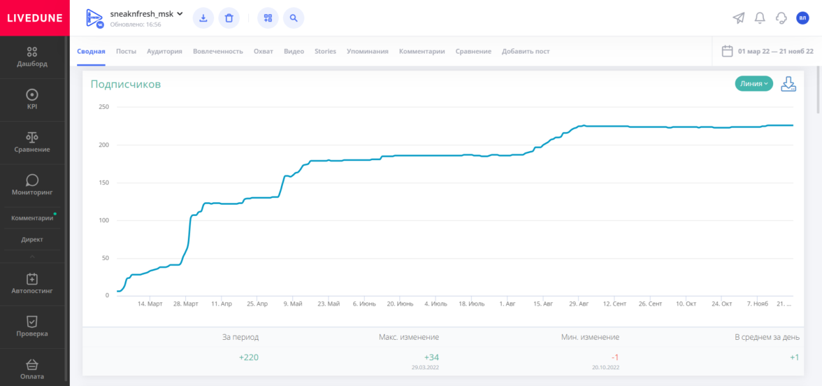 Статистика в LiveDune даёт объективную оценку всех маркетинговых активностей в профиле и сильно ускоряет анализ узких мест проекта. Исходя из него были приняты решения о дополнительном продвижении через Reels и корректировки в контент-стратегии.