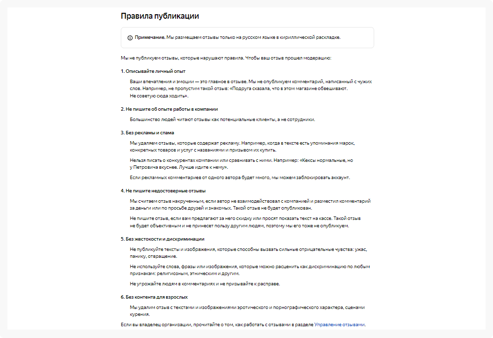 Администрация Яндекс.Карты предпочитает, чтобы отзыв был написан подробно и обязательно с описанием личного опыта. У площадки довольно строгие требования к содержанию отзыва. Ниже скриншот нескольких правил.
