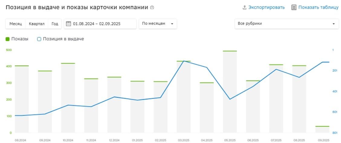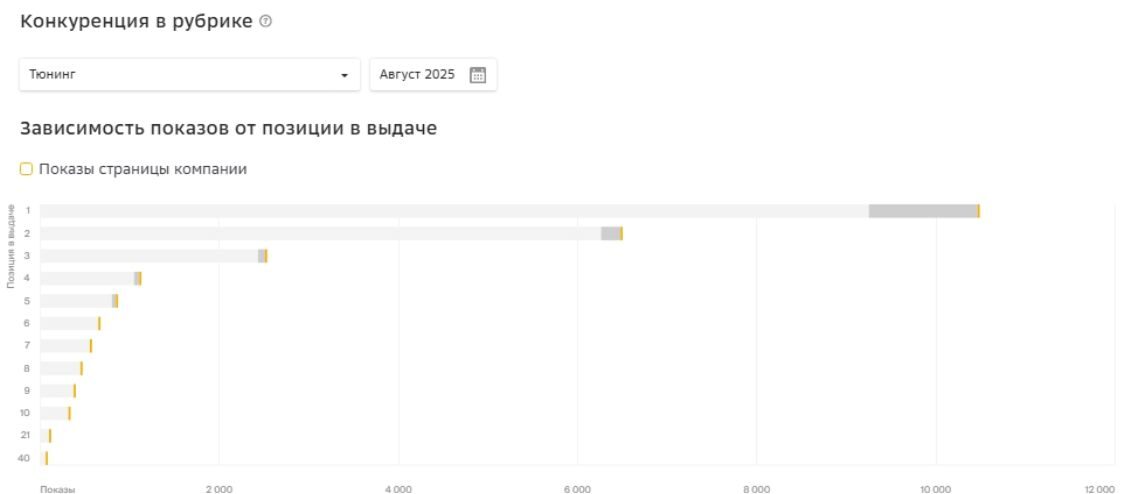 В процессе нашей активной работы с карточкой на площадке 2ГИС существенно выросли показатели позиций в выдаче: с 635 позиции поднялись до 119 позиции. При этом показы, например, в поисковой выдаче выросли с 6877 в категории «тюнинг» до 9251 по первой позиции: