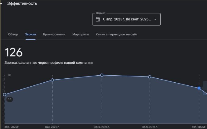 Профиль в Google картах не велся, так как клиент не считал его приоритетным. Мы переубедили его, показав текущую статистику и предложили такой же план работ: актуализация информации и официальные ответы на отзывы. В результате клиент стал получать стабильный поток звонков из Google maps: