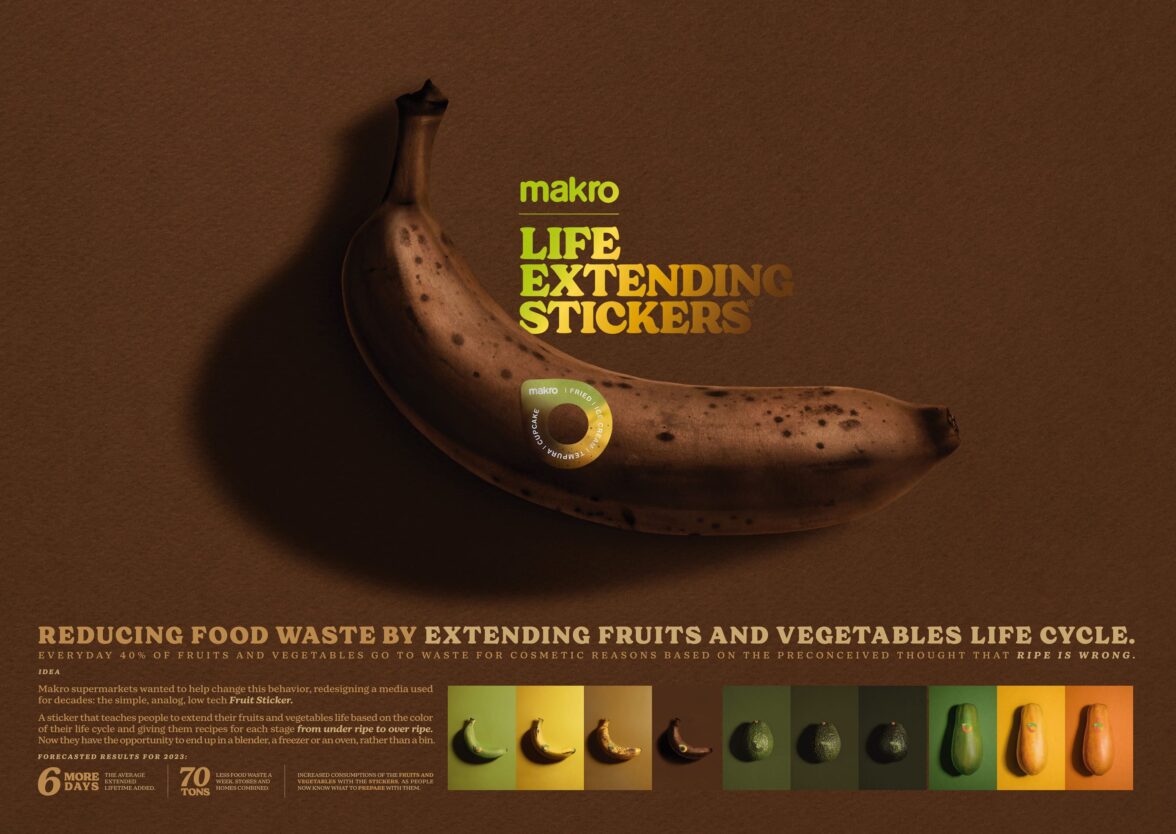 Сеть гипермаркетов Makro озаботилась проблемой перевода продуктов. Согласно их исследованиям, 40% фруктов и овощей отправляются в мусорку. Специально для сети студия VML разработала стикеры для овощей и фруктов, которые помогают по цвету определять спелость продукта и рассказывают, в каких блюдах их можно использовать.