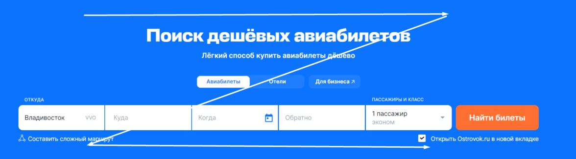 Взгляд пользователя сначала скользит по верхней горизонтали, затем перемещается вниз по диагонали и вновь сканирует информацию по горизонтали.