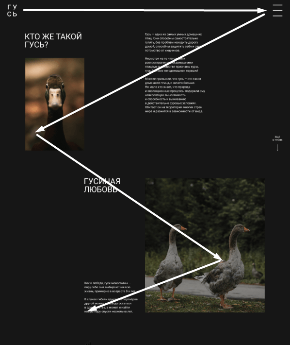 Зигзаг — второй вариант чтения информации на сайте пользователем по паттерну Z. (Пример прототипа сайта взяли из профиля Alena Vetrova на Behance).