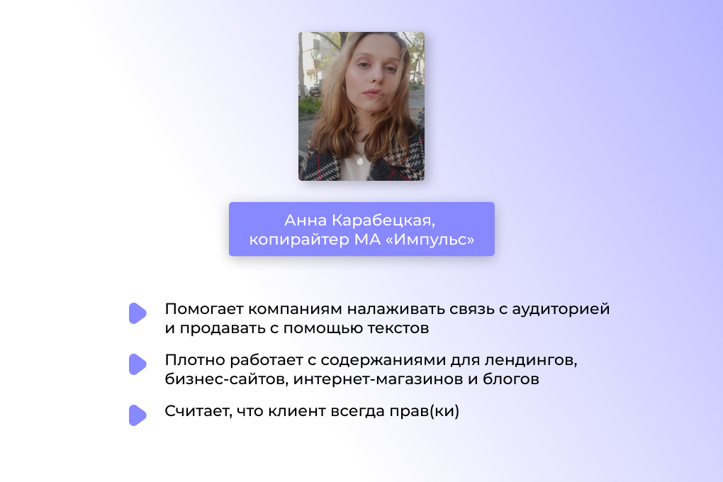 Совет копирайтера. Говорите на языке выгоды. Помните, что пользователи — люди, такие же, как и вы. Они заходят на ваш сайт, чтобы быстро понять, подходит ли им ваше предложение, выбрать и уйти по своим делам. Дайте им такую возможность! Избавляйтесь от абстрактных фраз в описании преимуществ вашего продукта.