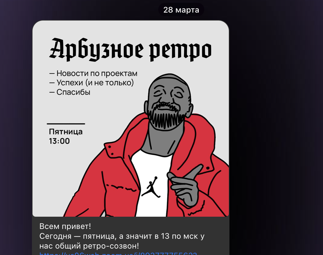 Первый сигнал — качество реализации задач. Если начинается халтура или небрежность в кейсах — это симптом. Второй — коммуникация в Telegram. Если в чатах проскальзывает пассивная агрессия или безразличие к KPI клиента, значит, «погода» в агентстве испортилась.Чтобы держать руку на пульсе, мы ввели «Арбузное ретро». Это еженедельный неформальный созвон без повесток и задач. Мы просто обсуждаем, у кого что в жизни. Динамика там очень показательна: кто говорит бодро, кто «потух», а кто вообще перестал подключаться. Если активный проджект или дизайнер начинает отмалчиваться — это тревожный звоночек. Человек выпадает из потока.
