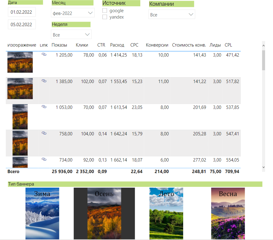 Когда мы подошли к запуску медийной рекламы, то поняли, что хотим оценивать эффективность каждого баннера. Посмотреть сводку по кампаниям недостаточно, так как хотелось собрать воедино все показатели, дополнить их конверсиями и ценой лида, а этой информации не найти в аналитических и рекламных системах.