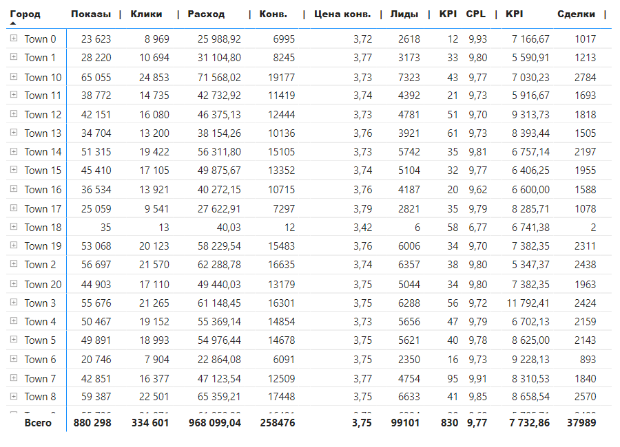 Таблица нужна для оперативной оценки эффективности рекламных кампаний. Маркетолог открывает ее и сразу видит, сколько лидов и сделок принесла реклама по каждому из городов, какая у них цена и насколько она отличается от оптимальной.