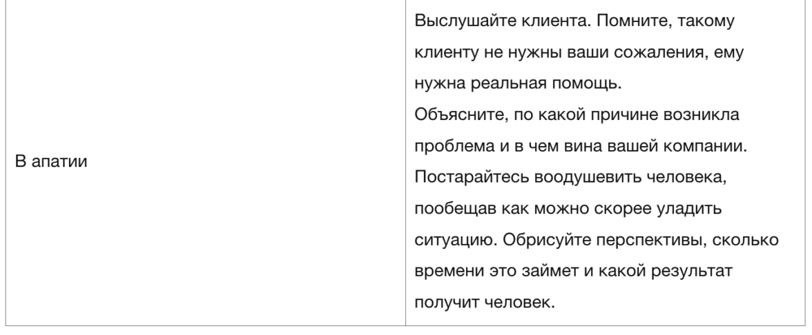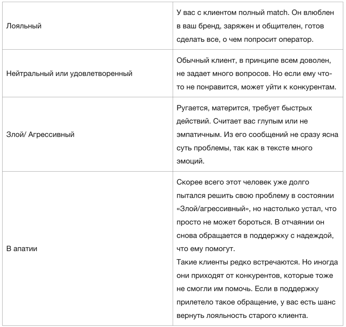 На схеме изображены основные группы эмоций, которые может испытывать клиент на момент обращения в поддержку. В колонке справа перечислены действия, которые должен предпринять оператор, чтобы повлиять на настроение человека. На самом деле, в оригинальной схеме эмоциональных «ступенек» намного больше, но этих четырех, как правило, достаточно для взаимодействия с пользователями в социальных сетях и мессенджерах.Как применять схему на практике